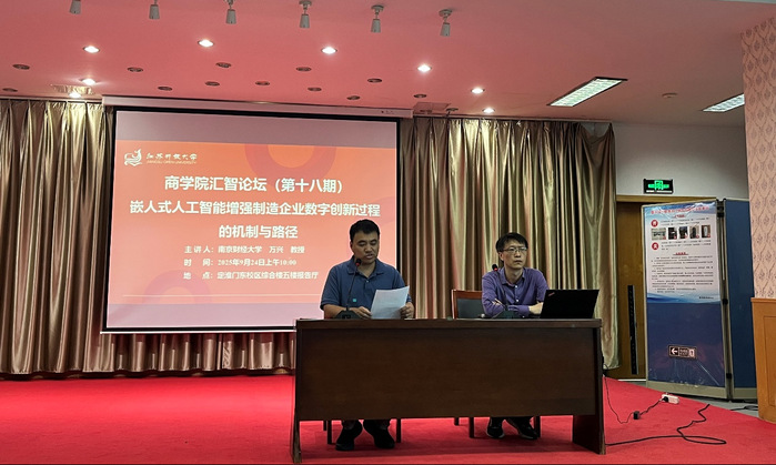9月24日上午,商学院于综合楼五楼报告厅成功举办汇智论坛(第十八期),本期论坛聚焦于“嵌入式人工智能增强制造企业数字创新过程的机制与路径”,特邀南京财经大学教授万兴主讲。此次论坛由商学院副院长朱长春主持,商学院全体教师参加。
