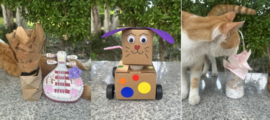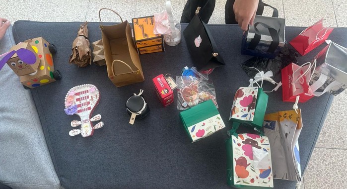 活动中,同学们围绕校园常见闲置物品如旧纸箱、塑料瓶、快递包装等,展开天马行空的创作。有同学将旧纸箱精心打造成古韵琵琶摆件,以珍珠勾勒轮廓,用毛绒花朵点缀琴身,融合传统乐器元素与现代装饰风格,既是一件精美的桌面陈设,又展现对传统文化的创新表达。还有同学把废旧纸箱和小轮子结合,制作出萌趣纸箱小狗玩具车,紫色毛绒耳朵俏皮可爱,彩色圆点贴纸活力满满,不仅是同学们的玩伴,更体现废物利用的巧思。此外,旧衣物被改造成个性挂件、瓶盖拼贴成创意装饰画等作品也层出不穷,每一件都凝聚着同学们的创意与匠心,让“旧物”真正实现“焕新颜”。