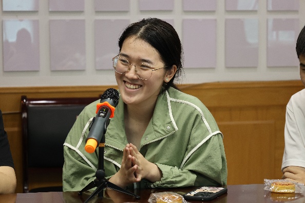 交流互动环节,17名2025级少数民族学生依次自我介绍,并分享各自民族的中秋传统与成长故事。苗族学生讲述家乡的山、家乡的水、苗族的服饰,朝鲜族学生描绘中秋祭祀的肃穆及与家人同做打糕、松饼的热闹交织的场景……不同民族的习俗和文化表达在座谈会上交织成一幅生动的民族团结画卷。