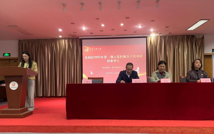 11月6日中午12:30,2025年东校区第一期入党积极分子培训班结业典礼在东校区图书馆五楼报告厅举行。学校组织部部长、党校常务副校长胡大华,设计学院党总支书记、分党校校长邹佳,商学院党总支副书记、副院长丁晓华及东校区2025年第一期入党积极分子参加。结业典礼由商学院左慧宇老师主持。