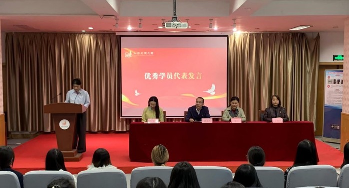 设计学院王梦雨同学作为优秀学员代表进行发言,她分享培训期间的学习感悟,并承诺将把培训所学转化为实际行动,在校园服务和社会实践中发挥先锋模范作用,并号召全体学员,把青春向党的坚定追求融入日常、落到实处,用实实在在的行动,传递新时代青年一心向党的坚定决心。