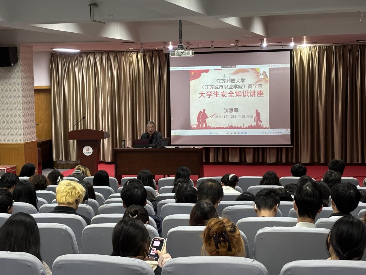为增强学生安全防范意识,营造平安和谐的校园环境,2025年11月12日18:30,商学院特邀江苏警官学院教授、江苏省首席科技传播专家沈惠章为2025级全体新生带来一场内容详实、实用性强的安全教育讲座。讲座以线上+线下方式进行,主会场设在东校区图书馆五楼报告厅,分会场在各新生班晚自习教室进行,内容涵盖防盗、防骗、消防安全、网络安全等多个领域,切实为全院520余名新生上好“入学安全第一课”。讲座由商学院辅导员杨旭东主持。