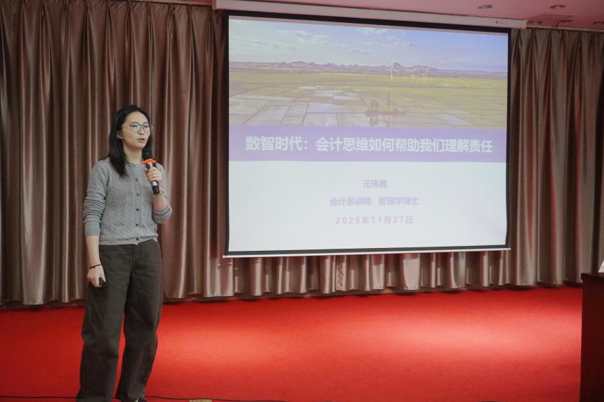 在数智时代背景下,掌握会计思维,方能成为算得清、看得远、负得起责的时代参与者。2025年11月27日12:30,商学院在东校区图书馆五楼报告厅成功开展数智商学堂第十七讲——“数智时代:会计思维如何帮助我们理解责任”。商学院会计系讲师、管理学博士汪玮茜主讲,商学院辅导员赵嘉琦主持,学院2024、2025级学生代表共计180余人参加。