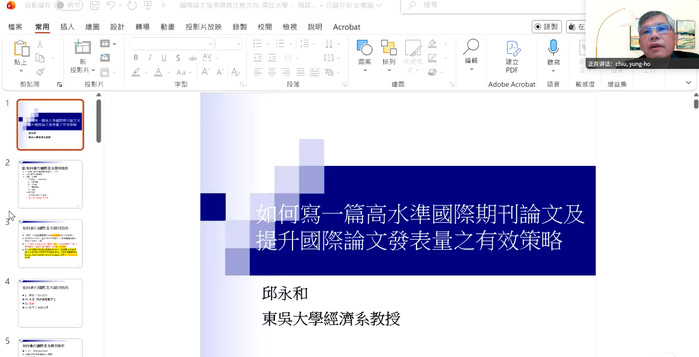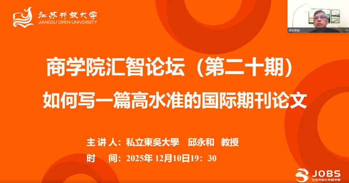 12月10日,商学院于线上成功举办汇智论坛(第二十期),本期论坛特邀国际知名学者、台湾东吴大学特聘教授邱永和主讲,主题为“如何撰写一篇高水准的国际期刊论文”。论坛由商学院院长周晓珺主持,学院全体专任教师参加。