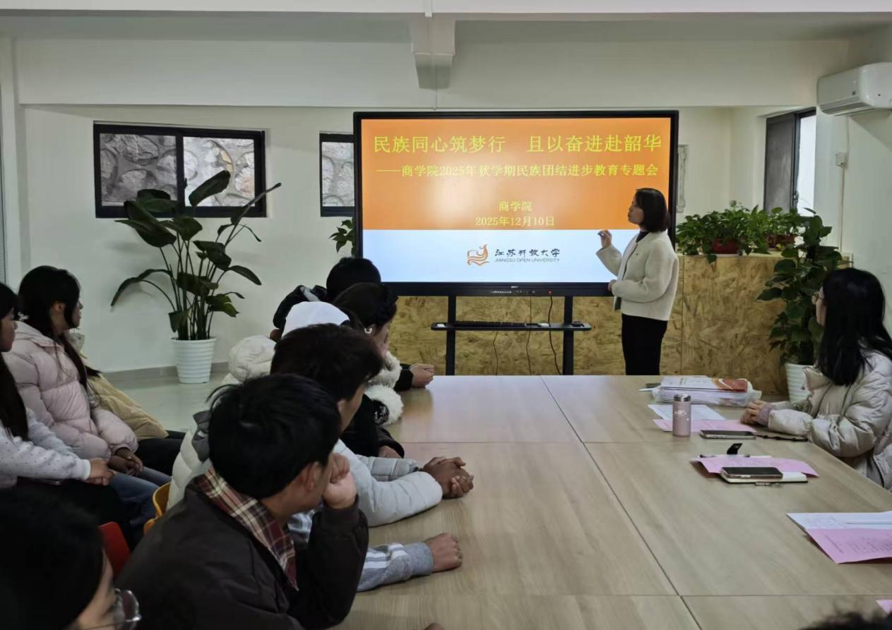 为深入学习贯彻党的二十大精神,全面落实习近平总书记关于加强和改进民族工作的重要思想,进一步铸牢中华民族共同体意识,2025年12月10日12:30,商学院在东校区“一站式”学生社区服务中心组织召开2025年秋学期民族团结进步教育专题会暨“暖冬行动”。商学院党总支副书记、副院长丁晓华、关工委黄祝良、学工办主任张慧、2024级入党积极分子代表及2025级全体少数民族学生参加,会议由任静静主持。