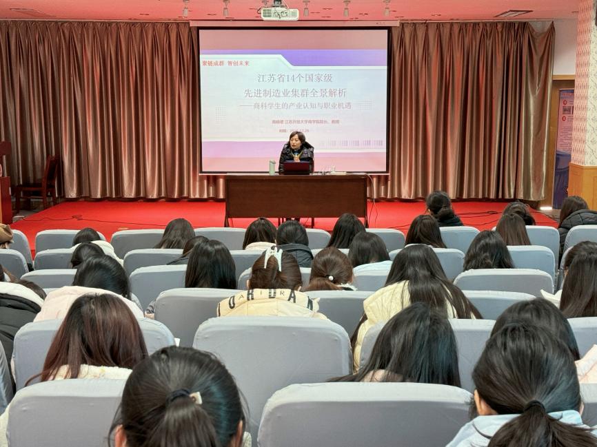 为帮助同学们了解商科产业发展的新趋势与职业成长的新机遇,2025年12月26日12:30,商学院在东校区图书馆5楼报告厅组织开展“数智商学堂”第十九讲,讲座主题为“‘聚链成群 智创未来’江苏省国家级先进制造业集群全景解析——商科学生的产业认知与职业机遇”,商学院院长、管理学博士、会计学教授周晓珺主讲,商学院辅导员赵嘉琦主持,学院2024、2025级学生共计150余人参加。
