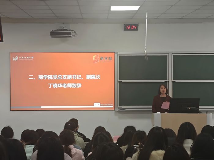 12月18日12:30,商学院2025年院级“青马工程”培训班开班仪式在东校区教学楼1-1阶梯教室顺利举行。学院党总支副书记、副院长丁晓华、学工办主任张慧、团总支书记胡燕、团总支委员及91名学员参加,开班仪式由胡燕主持。