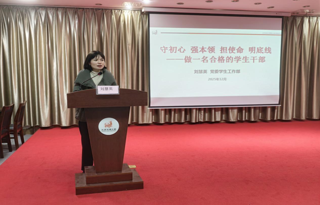 12月23日12:30,在东校区图书馆五楼报告厅,党委学生工作部、党委武装部、学生工作处(就业创业指导中心)处长刘慧英以“守初心、强本领、担使命、明底线”为核心,为大家明晰合格学生干部的成长路径。她引导学员坚守服务同学的初心,锤炼履职本领,扛起时代使命,严守纪律底线,为学员成长成才提供了系统指引。