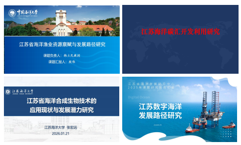 研讨会首先由《江苏海洋渔业资源禀赋与发展路径研究》、《江苏海洋碳汇开发与利用研究》、《海洋合成生物技术的应用现状与发展潜力研究》、《江苏数字海洋发展路径研究》等四个中心年度委托课题组就中期研究成果进行汇报。专家组就各课题的研究价值、实践意义以及未来深化方向提出意见,现场讨论气氛热烈。